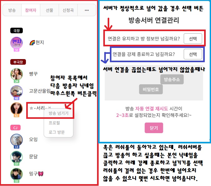 참여자 목록에서 다음 방송자 닉네임 프사 말고 이름을 마우스 왼쪽 버튼 클릭